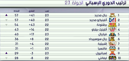 وريال مدريد الاول واتلتكو الثاني .. وذلك بفارق الاهداف..